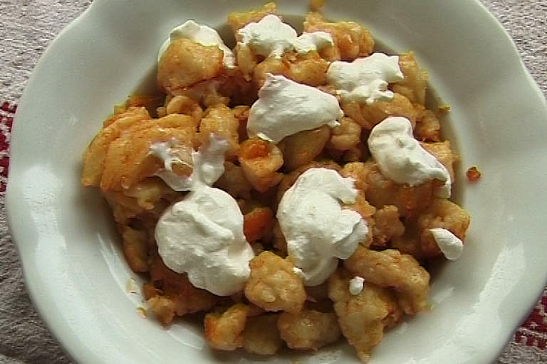 Hozzávalók: 1 kg krumpli, só, 2 fej vöröshagyma, 2 evőkanál őrölt fűszerpaprika, annyi liszt, amennyit a krumpli felvesz. A tálaláshoz 4,5 dl tejföl.