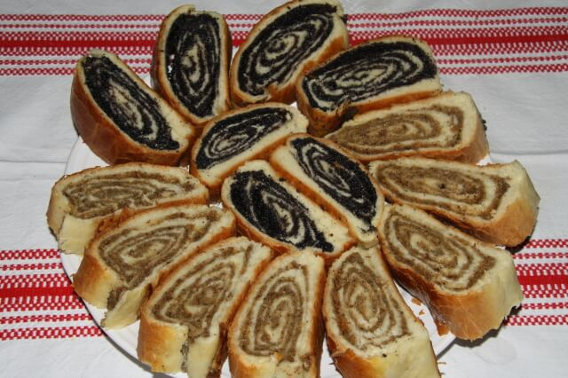 Hozzávalók: másfél kg liszt, 5 dkg élesztő, 8 evőkanál cukor, 2 teáskanál só, 2 egész tojás, 1 tojás sárgája, 1 evőkanál sertészsír, 1 liter házi tej. A mákos töltelékhez: 50 dkg darált mák, 30 dkg cukor, 2 vaníliás cukor. A dióshoz: 60 dkg darált dió, 40 dkg cukor, 1 bio citrom reszelt héja. Három evőkanál olvasztott zsír, 2 felvert tojás.