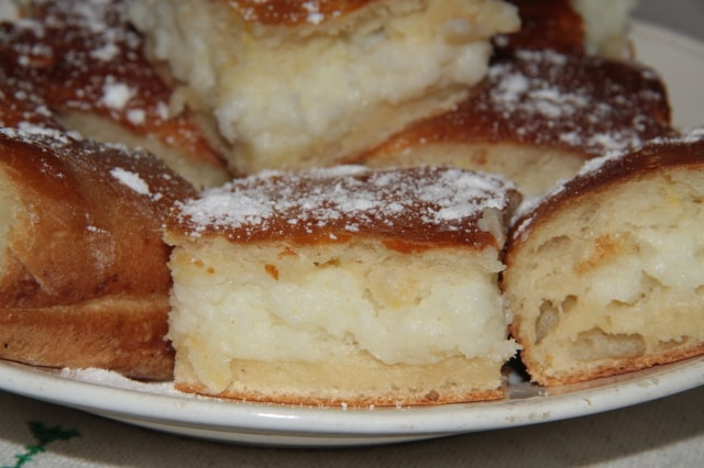 Két tepsit kizsírozunk. Az első két lapot a sütőformák aljába helyezzük. A kihűlt grízt villával áttörjük, és elfelezve a tésztákra kenjük. A megmaradt két cipót ugyanúgy kisodorjuk, mint az előzőket, ezek kerülnek a sütemény tetejére. Tíz percig még kelni hagyjuk, utána felvert tojással átkenjük, villával sűrűn átszurkáljuk, és előmelegített sütőben szép aranyló barnára sütjük.