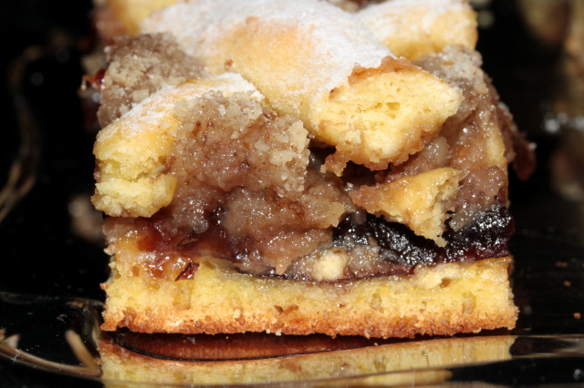 A megpihent kevert kőtt tetejét átkenjük szilvalekvárral, és megszórjuk cukros dióval. A félretett tésztát kevés liszttel keményebbre keverjük, hogy rácsokat tudjunk készíteni belőle. Lisztezett deszkán sodrogatva alakítjuk ki a rudacskákat, és a sütemény tetejére helyezzük.