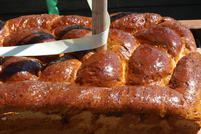 A tésztát kétfelé szakítjuk, egyikből három egyenlő hosszúságú rudat sodrunk, amit hármas fonással megfonunk. Ezt a kikent tepsi közepére helyezzük. A maradék tésztából egy hosszabb rudat készítünk, ezt egy kicsit megtekerjük, és úgy helyezzük a kalács köré. Felvert tojással átkenjük a tetejét, letakarjuk, és további 40-45 percig kelesztjük. Ezután még egyszer átkenjük tojással, és előfűtött kemencében, vagy sütőben megsütjük.