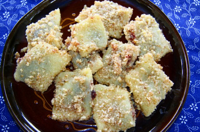 Hozzávalók: fél liter langyos tej, 3 dkg élesztő, 10 dkg cukor, 3 egész tojás, 1 teáskanál só, 60 dkg kukoricaliszt, 10 dkg sertészsír, 15 dkg darált mák 15 dkg cukorral összekeverve, 1 citrom reszelt héja, a tetejére porcukor. A tepsi kikenéséhez sertészsír, liszt.