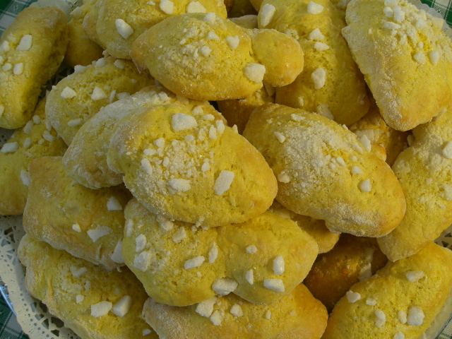 6 egész tojást és egy sárgáját tányérba felütünk. Az egy fehérjét félretesszük. A lisztbe beleöntjük a tojásokat, a cukrot, és a szalalkálit, majd lágy tésztát dagasztunk belőle. Amikor jól kidolgoztuk, egy kis diónyi adagot sütőpapírra téve pár perc alatt átsütünk, így megbizonyosodhatunk arról, hogy jó a tészta. Ha szükséges, még lisztet adhatunk hozzá, de fontos, hogy nem folyós, de lágy tésztánk legyen. Az egészet vastagon meglisztezett gyúródeszkára öntjük, és sok liszttel szórva (a kezünket és a sodrófát is lisztezve) apránként csíkokat sodrunk belőle, ezeket kb. 7 cm-es rudakra szeleteljük. Tetejüket a megmaradt tojás fehérjével megkenjük. A kockacukrot húsklopfolóval durvára törjük, és ezt szórjuk a pogácsákra.