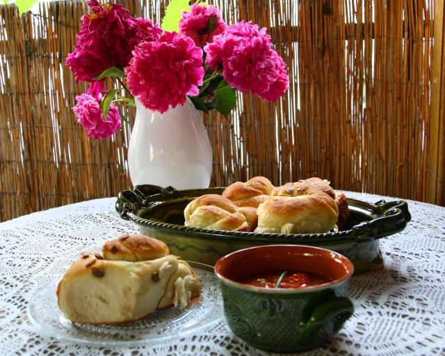 A sütőedényt kizsírozzuk, belehelyezzük a tésztákat. Tetejüket újra átkenjük zsírral, tökmagot nyomkodunk bele, egy deci sós vizet öntünk alá. Lefedve pár percig újra kelesztjük, majd előmelegített sütőben kb. háromnegyed óra alatt megsütjük. Ekkor a tetőt levéve ropogósra pirítjuk.