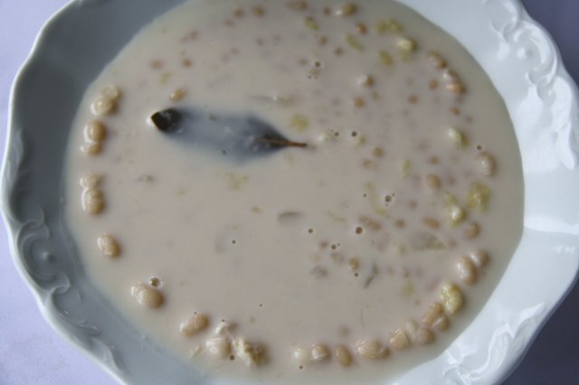 A babot előző este beáztatjuk. Másnap egy liter vízben feltesszük főni. A krumplit megtisztítjuk, kis kockákra feldaraboljuk. Amikor félig megpuhult a bab, leöntjük róla a levet. Újra felöntjük másfél liter vízzel, és a tejjel. Hozzáadjuk a sót, a fokhagymát, két babérlevelet. Amikor puhára főtt minden, csipetkét készítünk hozzá. A lisztet egy tojással, csipetnyi sóval jó alaposan kigyúrjuk, majd lisztes kézzel elcsipkedjük. Ezt is belefőzzük a tejes bablevesbe.