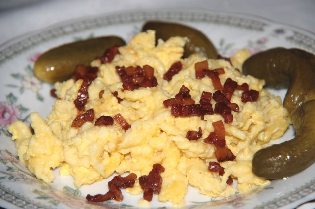 Tálalásnál a félretett szalonna pörcökkel és tejföllel kínáljuk.