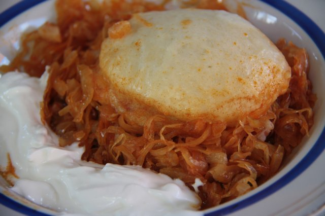 Hozzávalók: 50 dkg liszt, 2,5 dkg élesztő, 2 dl tej, 1 evőkanál cukor, 1 teáskanál só, 1 evőkanál sertészsír. A káposztához: 2 vöröshagyma, 20 dkg füstölt szalonna, 1 kg savanyú káposzta, 3 babérlevél, 2 evőkanál őrölt paprika, 1 evőkanál zsír. A tálaláshoz 2 dl tejföl.