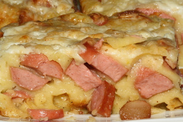 Hozzávalók: 1 kg liszt, 5 dkg élesztő, 1 teáskanál cukor, 1 teáskanál só, 4,5 dl aludttej, 3 tojás, 3 dl tej, fél dl étolaj. Töltelék: 2 evőkanál zsír, 1 kg darált sertéshús, 15 dkg gomba, 15 dkg kukorica, 15 dkg vöröshagyma, só, 1 kávéskanál őrölt feketebors, 2 dl tejföl, 15 dkg reszelt sajt, 1 evőkanál paprikakrém, 1 paradicsom. A sütéshez 1 liter étolaj.