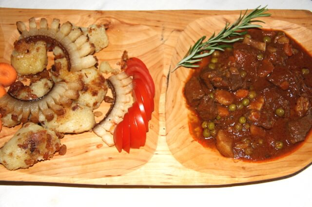Hozzávalók: (10 főre) 2 kg szarvascomb, 8 dkg sertészsír, 50 dkg vöröshagyma, 2 gerezd fokhagyma, 15 dkg zöldpaprika, 8 dkg paradicsom, 15 dkg füstölt szalonna, 30 dkg vargánya, 15 dkg zöldborsó, 20 dkg sárgarépa, 10 dkg petrezselyem, 1,5 dl vörösbor. Fűszerek: 2 dkg őrölt paprika, só, 1 evőkanál paprikakrém, 1 teáskanál őrölt kömény, 1 kis csokor kakukkfű és rozmaring.