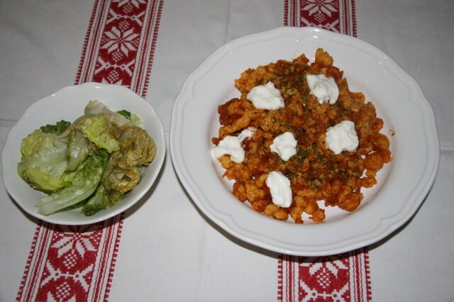 Hozzávalók: 5 tojás, 3 evőkanál búzadara, 50 dkg liszt, 3 dl víz, 3,5 teáskanál só, 5 közepes nagyságú vöröshagyma, 1,5 dl étolaj, 2 evőkanál őrölt paprika. A salátához: 3 kisebb saláta, 4 gerezd fokhagyma, 1 evőkanál étolaj, 2 kávéskanál só, 5 evőkanál cukor, fél liter víz, 2 evőkanál ecet. A főzővízbe 2 teáskanál só. A tálaláshoz vágott petrezselyem zöldje, 1 dl tejföl.