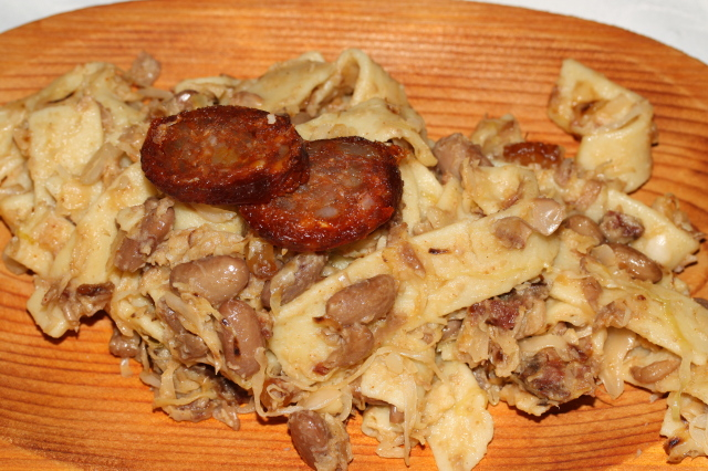 Hozzávalók: a tésztához: 3 tojás, 50 dkg liszt, víz, csipetnyi só. 10 dkg füstölt szalonna, 20 dkg füstölt kolbász, 40 dkg savanyú káposzta, 2 evőkanál sertészsír, 25 dkg szárazbab, só.