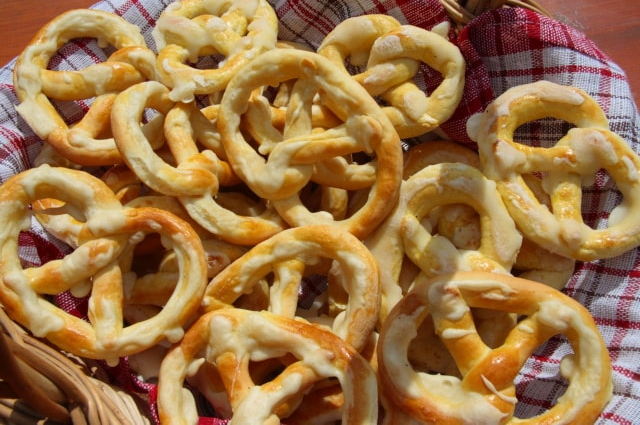 10 dekányi sertészsírt 10 dkg liszttel összeolvasztunk, és a kisodort tésztán egyenletesen szétkenünk. Felgöngyöljük, mint a kalácsot, majd háromfelé szétválasztjuk. Ezeket egyenként kisodorjuk, és kb. 6 centis négyzetekre vágjuk.