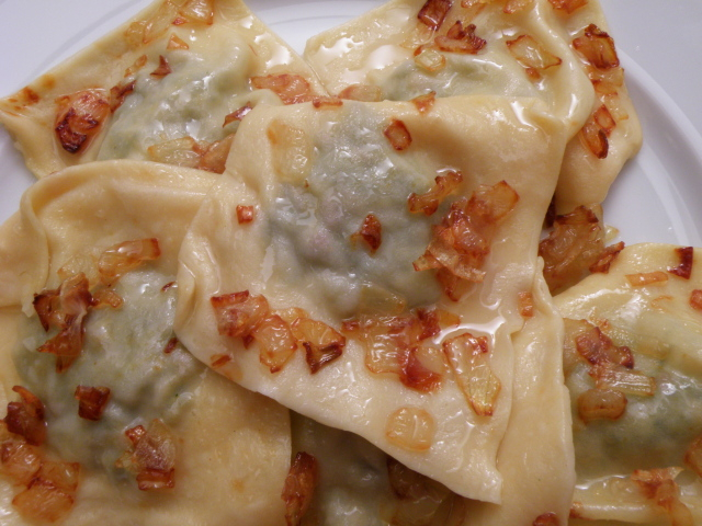 Hozzávalók: a tésztához: 30 dkg liszt, 2 tojás, csipetnyi só. A töltelékhez: 15 dkg húsos füstölt szalonna, 1 nagyobb fej vöröshagyma, 15 dkg darált sertéshús, 15 dkg spenót, 1 zsemle, só, őrölt feketebors. A kifőtt derelyékre: 2 fej vöröshagyma, 1 dl étolaj.