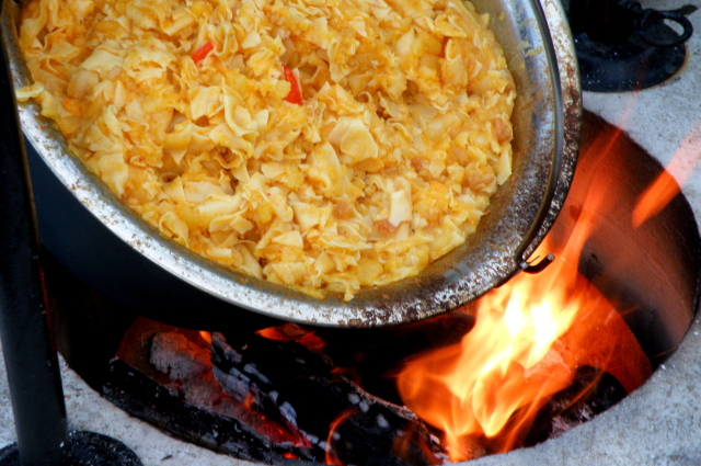 A megkelt tésztát lisztezett gyúródeszkán elsodorjuk, a párolt, kihűtött káposzta felét rásimítjuk, majd összehajtogatjuk. Újabb negyed órát kelesztjük.