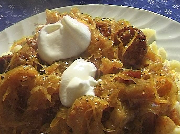 Hozzávalók: 2 fakanál sertészsír, 1 nagy fej vöröshagyma, 2 gerezd fokhagyma, 25 dkg füstölt csülök zsírosabb része, 25 dkg füstölt kolbász. Kétcsipetnyi majoránna, 1 kávéskanál őrölt feketebors, 2 babérlevél, 3 teáskanálnyi őrölt fűszerpaprika. 80 dkg savanyú káposzta, néhány zöldpaprika- és póréhagyma karika.