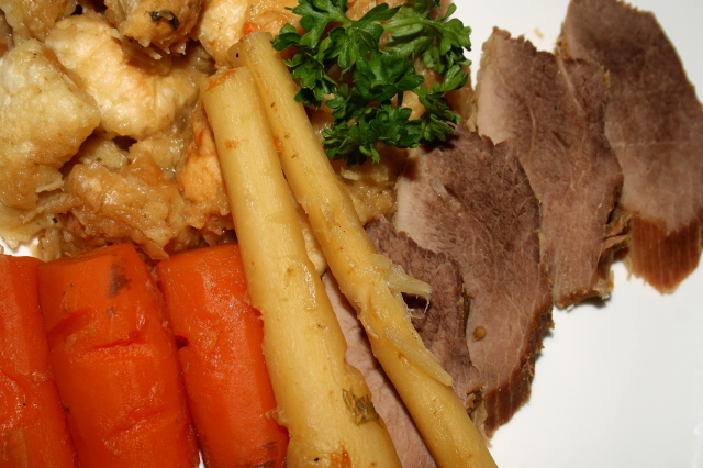 A párolt marhahúst a tormás zsemlemártással, és a levesből kiszedett zöldségekkel együtt tálaljuk