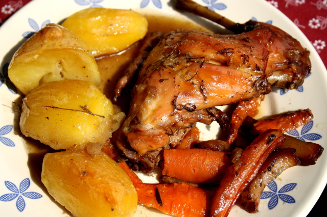 A nyulakat nagyobb darabokra vágjuk, tepsibe helyezzük, és sóval bedörzsöljük. A szalonnát felcsíkozzuk, mellédobjuk, és az egészet forró zsírral leöntjük. Fűszerezzük babérlevéllel, kakukkfűvel, borssal. A zöldségeket megtisztítjuk, nagyobb darabokra vágjuk, ezeket is szétszórjuk a tepsiben. Meglocsoljuk vörösborral, kevés vízzel, majd befedjük, és kemencében, vagy sütőben kb. 2 óra alatt megsütjük. Közben néhányszor az elfőtt levet pótoljuk.