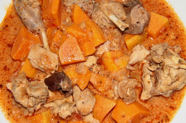 Másnap a húst kiszedjük a pácból, és egy serpenyőben étolajon mindkét oldalukon hirtelen átsütjük, hogy a rostok lezáródjanak. A visszamaradt zsiradékon a kis kockákra vágott füstölt szalonnát üvegesre pirítjuk, beleborítjuk a páclevet, és az egészet összefőzzük. Belehelyezzük a hússzeleteket, felöntjük 3-4 dl vízzel, és fél óráig, fedő alatt, lassú tűzön pároljuk. Ekkor meghintjük őrölt paprikával, és belekeverjük a hasábokra vágott sárgarépát. Újabb egy órát főzzük, ezután kerül bele a vörösbor, és csak ekkor sózzuk az ételt. Újabb félórányi rotyogtatás után tálalhatjuk.