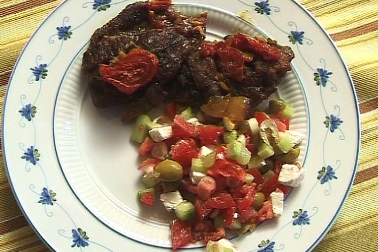 A zöldsalátához: paradicsom, uborka, póréhagyma, feta sajt, só.