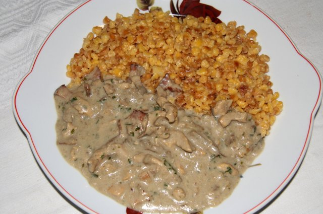 A füstölt húsokat nagyobb darabokra vágjuk. A kolbászt félkarikákra aprítjuk. Ez kerül először a hagymára, mert hosszabb sütési időt igényel. Rászórjuk az őrölt paprikát, felöntjük egy deci vízzel, és rövid forralás után ebbe a sűrű szaftba boríthatjuk bele a tarját és az oldalast. Csipetnyi sóval, őrölt borssal fűszerezzük, majd a kicsumázott, felkockázott paprikákat is hozzáadjuk. Összekeverjük, a tetejére pakoljuk az elősütött combszeleteket, lefedjük, és együtt pároljuk puhára az egészet.