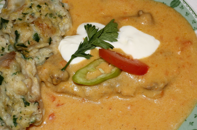 A langyosra hűlt hústekercsekről leszedjük a cérnát, utána kisebb darabokra felvágjuk, és visszatesszük a mustáros, tejfölös alapba. Ebben kicsit állni hagyjuk, majd a gombócokkal együtt tálaljuk.