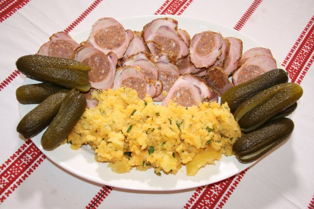 Hozzávalók: (8 főre) 2 tüskepecsenye (sertés szűzpecsenye), 2 sertés fátyolháj, 1,5 kg sertés darált vegyes hús, só, őrölt feketebors, őrölt paprika, őrölt kömény, fokhagyma. Köret: 1 kg krumpli, só, 1 csokor petrezselyemzöld, pecsenyezsír.