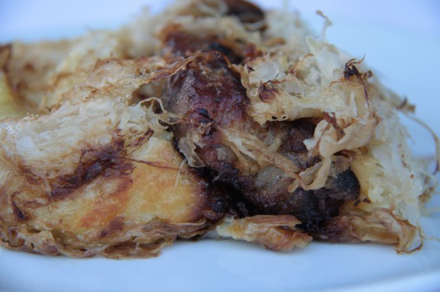 Kizsírozott tepsiben kézzel elegyengetjük, ujjunkkal kicsit megnyomkodjuk, és szép színesre sütjük.