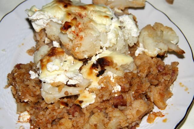 A karfiolt megtisztítjuk, rózsáira szedjük, és forró, sós vízben félpuhára főzzük. A vöröshagymát megpucoljuk, apró kockákra vágjuk. Egy serpenyőben összemelegítjük a zsírt az olajjal, és megdinszteljük benne a hagymát. Két teáskanál őrölt paprikát keverünk bele, majd hozzáadjuk a darált sertéshúst, és a kis kockákra vágott füstölt tarját. Annyi vizet öntünk rá, hogy ellepje az edény tartalmát. Paprikakrémmel, őrölt feketeborssal fűszerezzük, és kb. fél óráig főzzük. Ekkor hozzáadjuk az alaposan átmosott rizst. Ezzel együtt még tíz percig pároljuk.
