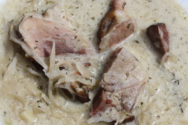 Hozzávalók: 1 kg füstölt sonka, 1 kg savanyú káposzta, 2 evőkanál házi sertészsír, 5 evőkanál liszt, 1 vöröshagyma, só, 2 babérlevél, 1 evőkanál majoránna, 1 teáskanál őrölt bors, 2 dl tejföl, 1 csokor kapor.