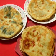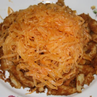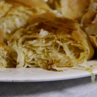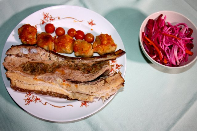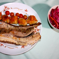 Töltött oldalas májjal, hagymás dödöllével és vegyes salátával