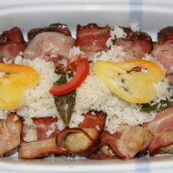 Sonkaszalonnába göngyölt csirkemáj és gombafejek