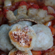 Gombóc juhtúróval és kolbásszal töltve, lecsós ágyon