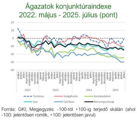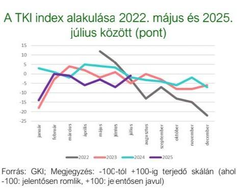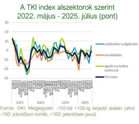 A TKI index 2025. júliusban -1 ponton állt (-100 és +100 közötti skálán értelmezve), mely azt jelenti, hogy az ágazat szereplői helyzetüket stagnálónak érzékelték. Az index értéke a múlthavi 4 pontos csökkenés után 6 ponttal nőtt az év hetedik hónapjában, s így 1 ponttal meghaladta az egy évvel ezelőtti értékét. A szálláshely-szolgáltatásban 18 ponttal +4 pontra, a vendéglátásban 1 ponttal -6 pontra nőtt az index, míg az egyéb turisztikai szektorban 0 ponton stagnált.