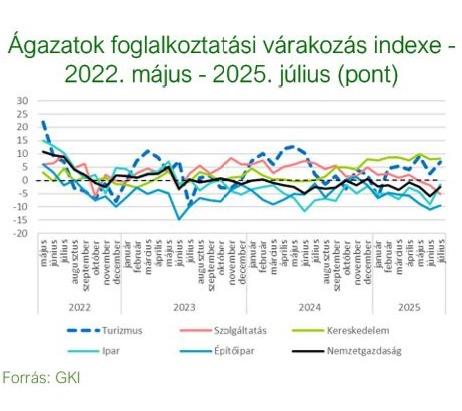 A turizmus foglalkoztatási várakozás indexe (+7 pont) 2025. júliusban jóval meghaladta a GKI EU számára végzett konjunktúrakutatásában mért, a szolgáltatási szektorra számított index értékét (-5 pont), valamint a nemzetgazdasági átlagot (-2 pont). Elmaradt kissé a kereskedelem indexétől (+8 pont), meghaladta ugyanakkor az építőipar (-9 pont), valamint az ipar indexeit (-2 pont).