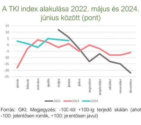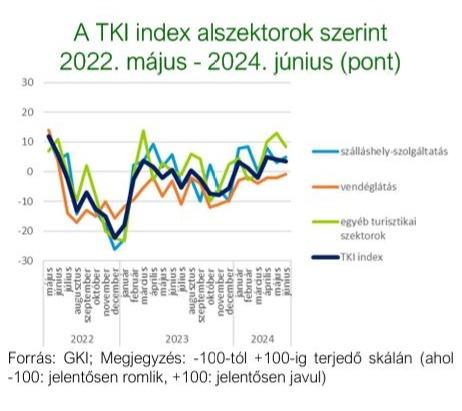 A TKI index 2024. júniusban +3 ponton állt (-100 és +100 közötti skálán értelmezve), mely azt jelenti, hogy az ágazat szereplői helyzetüket pozitívnak érzékelték. Az index értéke minimális mértékben, 1 ponttal csökkent az év hatodik hónapjában, ugyanakkor ezzel együtt is 2 ponttal meghaladja az egy évvel ezelőtti értékét. A szálláshely-szolgáltatásban 2 ponttal +5 pontra, a vendéglátásban 1 ponttal -1 pontra nőtt az index, míg az egyéb turisztikai szektorban 5 ponttal +8 pontra csökkent.
