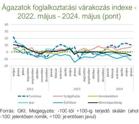 A következő három hónapban várhatóan jelentősen bővül a kereslet a turisztikai ágazatban igényelt munkaerő iránt. A turizmus foglalkoztatási várakozás indexe (+10 pont) 2024. júniusban meghaladta a GKI EU számára végzett konjunktúra-kutatásában mért, a szolgáltatási szektorra számított index értékét (+7 pont), ennél jobban a nemzetgazdasági átlagot (-5 pont). Magasabb volt a kereskedelem indexénél (0 pont), illetve sokkal magasabb az ipar és az építőipar indexél (-12, illetve -5 pont).