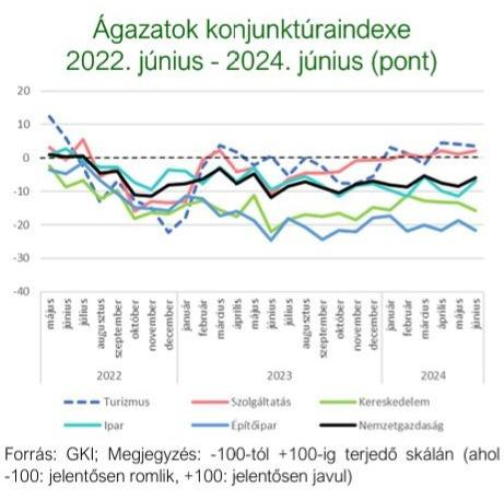 Továbbra is helytálló, hogy a szolgáltatási szektor és benne a turizmus konjunktúrája pozitív irányban elválik a gazdaság többi szektoráétól. A TKI index júniusban kissé meghaladta a GKI EU számára végzett konjunktúra kutatásában mért szolgáltatási szektor konjunktúraindexét (+2 pont), illetve jóval meghaladta a nemzetgazdasági átlagot képviselő GKI üzleti bizalmi indexet (-6 pont). Magasabb volt továbbá az ipar (-7 pont) és jóval magasabb a kereskedelem (-16 pont), valamint az építőipar (-22 pont) indexénél.