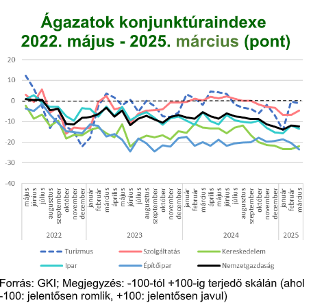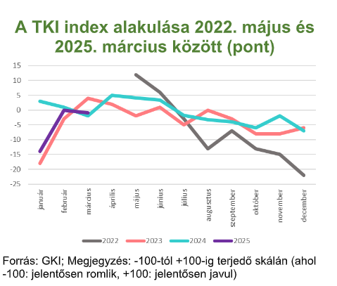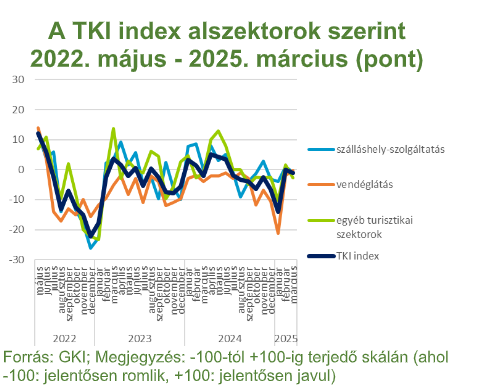 A TKI index 2025. márciusban -1 ponton állt (-100 és +100 közötti skálán értelmezve), mely azt jelenti, hogy az ágazat szereplői helyzetüket közel semlegesnek érzékelték. Az index értéke a múlthavi jelentős megugrás után 1 ponttal csökkent az év harmadik hónapjában, s így 1 ponttal meghaladja az egy évvel ezelőtti értékét. A szálláshely-szolgáltatásban 1 ponttal -1 pontra, az egyéb turisztikai szektorban 5 ponttal -3 pontra csökkent, míg a vendéglátásban 2 ponttal 0 pontra nőtt az index.