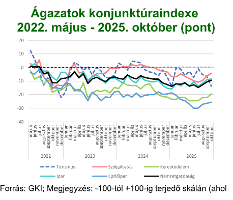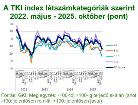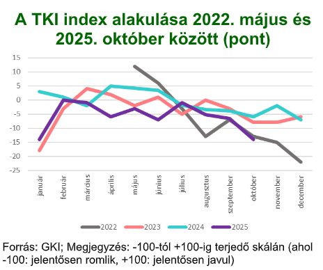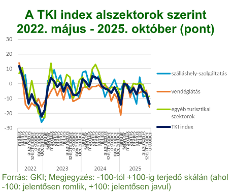 A TKI index 2025. októberben -14 ponton állt (-100 és +100 közötti skálán értelmezve), mely azt jelenti, hogy az ágazat szereplői helyzetüket negatívnak érzékelték. Az index értéke az elmúlt kéthavi összesen 6 pontos csökkenés után 7 ponttal csökkent tovább az év tízedik hónapjában, s így 8 ponttal elmaradt az egy évvel ezelőtti értékétől. A szálláshely-szolgáltatásban 8 ponttal -16 pontra, a vendéglátásban 11 ponttal szintén -16 pontra csökkent az index, míg az egyéb turisztikai szektorban -9 ponton stagnált.