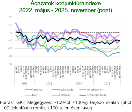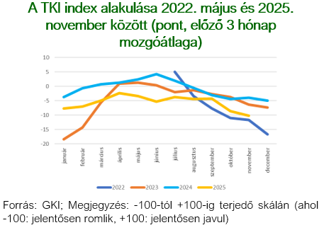 A TKI index 2025. novemberben -10 ponton állt (-100 és +100 közötti skálán értelmezve), mely azt jelenti, hogy az ágazat szereplői helyzetüket negatívnak érzékelték. Az index értéke az elmúlt háromhavi összesen 13 pontos csökkenés után 4 ponttal nőtt az év tizenegyedik hónapjában, s így 8 ponttal maradt el az egy évvel ezelőtti értékétől. A