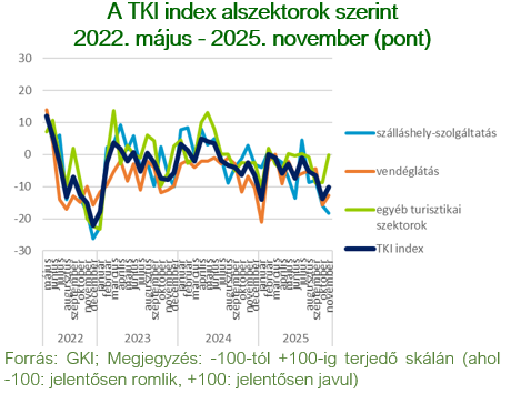 szálláshely-szolgáltatásban 2 ponttal -18 pontra csökkent, míg a vendéglátásban 3 ponttal -13 pontra, az egyéb turisztikai szektorban 9 ponttal 0 pontra nőtt az index.