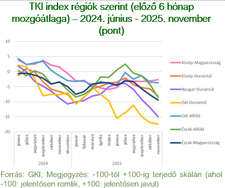 A központi régió kivételével a régiók romló turisztikai kilátásokat jeleztek novemberben, kiemelten rossz a helyzet a Dél- és Nyugat-Dunántúlon. A szezonalitás kisimítását célzó TKI index régiók szerint (előző 6 hónap mozgóátlaga) – 2024. június - 2025. november (pont) hathavi mozgóátlag esetében szembetűnő Dél-Dunántúl erőteljes visszaesése az elmúlt másfél évben, Nyugat-Dunántúlé és Észak-Alföldé az elmúlt négy hónapban.