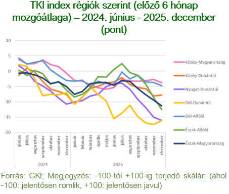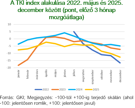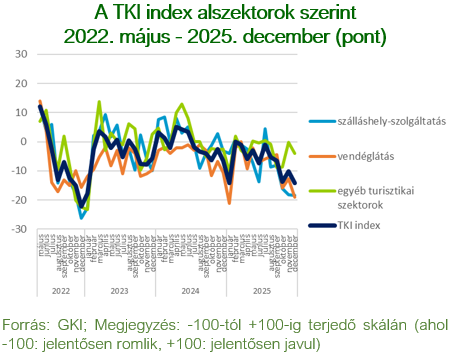 A TKI index 2025. decemberben -14 ponton állt (-100 és +100 közötti skálán értelmezve), mely azt jelenti, hogy az ágazat szereplői helyzetüket negatívnak érzékelték. Az index értéke az előző havi emelkedéssel megegyező mértékben, 4 ponttal csökkent az év utolsó hónapjában, s így 8 ponttal elmaradt az egy évvel ezelőtti értékétől. A szálláshely-szolgáltatásban nem változott, míg a vendéglátásban 6 ponttal, az egyéb turisztikai szektorban 4 ponttal csökkent az index.