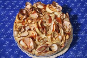 Közben az almák két végét levágjuk, magházukat kivájjuk, és vékonyra szeleteljük. Ezeket célszerű pár perc alatt kicsit megpárolni, hogy ne törjenek el munka közben.
