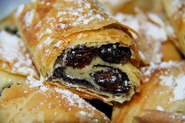 Az almás töltelékhez az almákat megtisztítjuk, és lereszeljük. Cukorral, fahéjjal ízesítjük, és amikor levet ereszt, jól kinyomkodjuk. A darált diót vaníliás cukorral, és porcukorral összekeverjük.