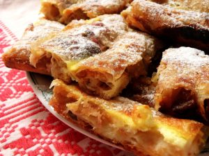 Az almás töltelékhez: 2 kg alma, 15 dkg kristálycukor, 3 teáskanál fahéj, 20 dkg darált dió, 3 csomag vaníliás cukor, 15 dkg porcukor.