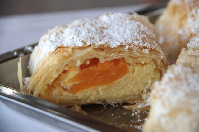 A rétest a terítő segítségével két oldalról a közepe felé felhajtjuk, tepsibe rakjuk. A rudak tetejét is meglocsoljuk zsírral és tejföllel, majd előmelegített sütőben megsütjük.
