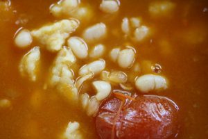 Hozzávalók: 1 kg bab, 1 fej vöröshagyma, 2 cseresznye paprika, 6 gerezd fokhagyma, 1 nagyobb petrezselyemgyökér, 3 sárgarépa, 2 paradicsom, 2 teáskanál őrölt paprika, só. A schupnudlihoz: 1 kg krumpli, 1 tojás, teáskanálnyi só, liszt (amennyit a krumpli felvesz), 15 dkg zsemlemorzsa, egy fakanál zsír. A csipetkéhez: 1 tojás, csipetnyi só, liszt. A rántáshoz: 3 fakanál sertészsír, 4 evőkanál liszt.