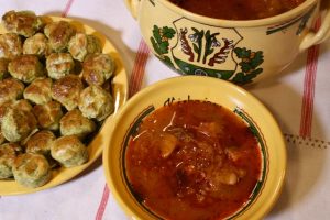 Hozzávalók: (8 főre) 1 kg savanyú káposzta, 50 dkg beáztatott tarkabab, 1 beáztatott füstölt hátsó csülök, 7 babérlevél, 2 teáskanál egészbors, 3 vöröshagyma, 1 fej fokhagyma, 2 teáskanál őrölt kömény, 1 teáskanál őrölt bors, 2 teáskanál só, 1 teáskanál majoránna, 4 evőkanál paradicsom sűrítmény, 2 paradicsom, 2 tv-paprika, 2 csípős paprika, 1 kávéskanál őrölt szerecsendió. A rántáshoz: 3 fakanál sertészsír, 1 vöröshagyma, 3 gerezd fokhagyma, 4 evőkanál liszt, 4 teáskanál őrölt paprika.
