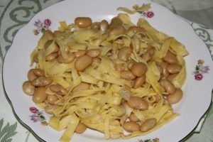Hozzávalók: 50 dkg száraz fehérbab, 1 sárgarépa, 1 petrezselyem, 1 vöröshagyma, 2 evőkanál sertészsír, só. A tésztához: 2 tojás, 20 dkg liszt, csipetnyi só.